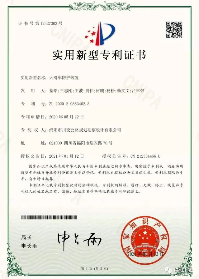 近日,我公司研发的“天滑车防护装置”喜获国家实用新型专利。这是继去年11月份开始,公司被国家知识产权局授权的第七项国家实用新型专利。