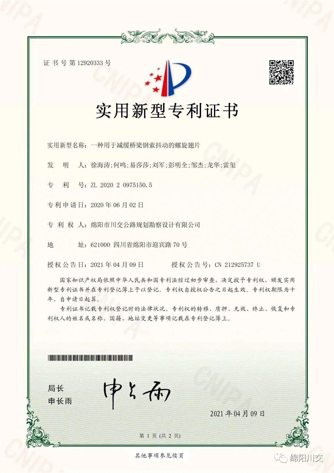 近日,我公司研发的“一种用于减缓桥梁钢索抖动的螺旋翅片”再次荣获国家知识产权局授予的国家实用新型专利。截止目前,公司已喜获十项国家实用新型专利。