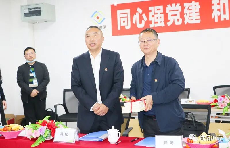 芶斌同志和何鸣同志最后签订了《党建和创协议书》并赠送书籍、合影留恋。