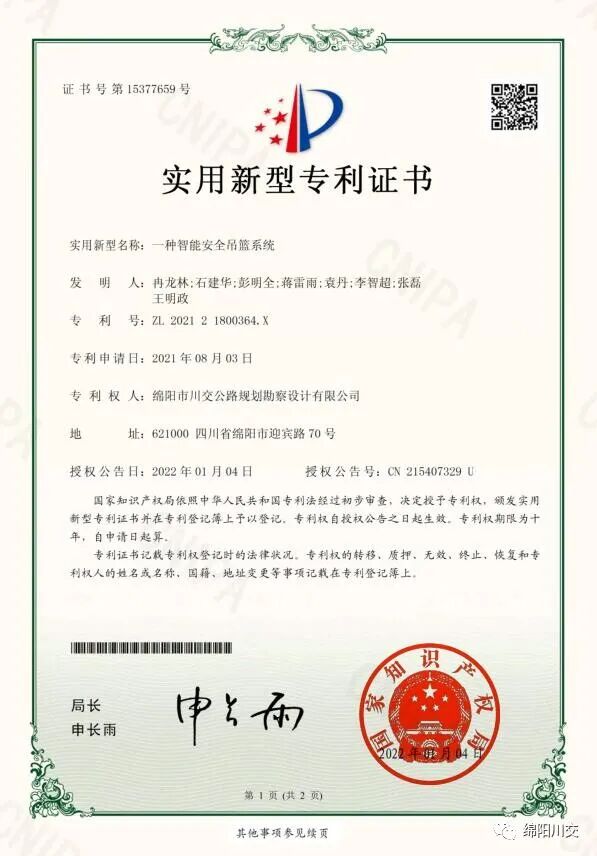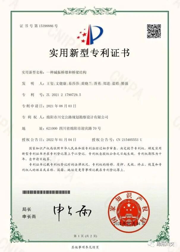 近日,我公司再添“一种减振桥墩和桥梁结构”和“一种智能安全吊篮系统”两项国家实用新型专利。截止目前,公司共被国家知识产权局授权12项国家实用新型专利。