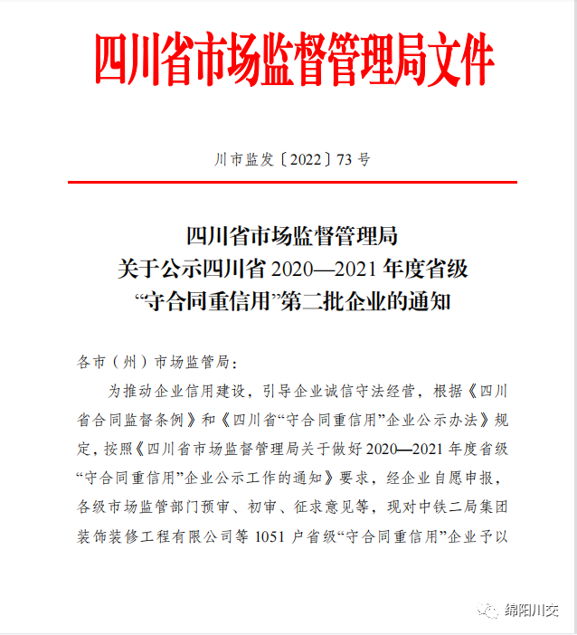 近日,我公司被四川省市场监督管理局授予四川省2020-2021年度省级“守合同重信用”企业称号。